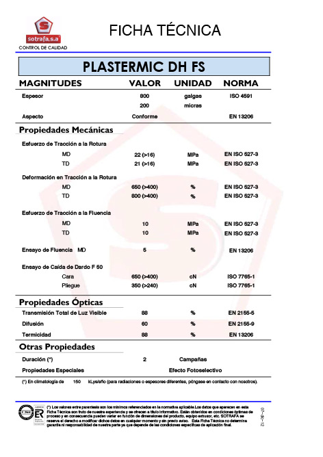 Folia termiczna z LDPE, rozproszająca, w kolorze białym (H) i z efekt fotoselektywnej (FS). Produkowane w wielowarstwowych systemach ko ekstruzji w różnych grubościach. Folia ta zawiera dodatki fotoselektywne, które blokują promieniowanie UV.B między 280 i 390 nm.