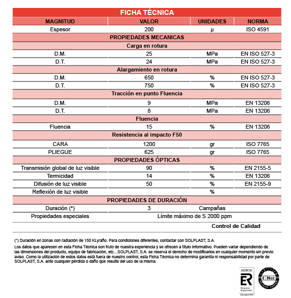 High transmission of visible light, which permits the heating of the growing area, favoring plant development throughout the service life of the plastic.