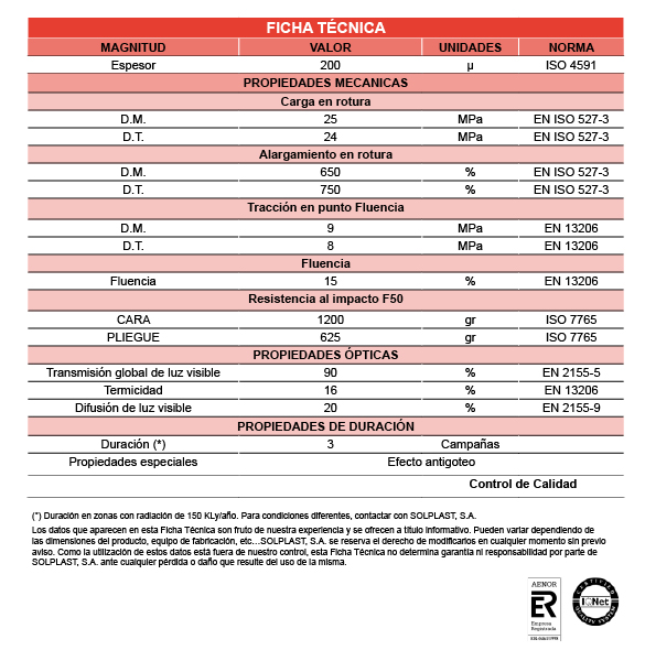 • High transmission of visible light, which permits the heating of the growing area, favoring plant development throughout the service life of the plastic.