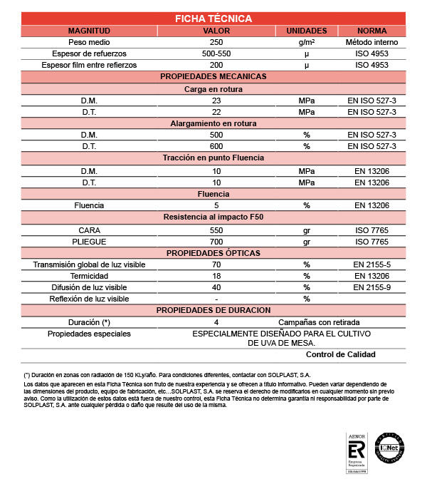 Specjalna folia Solplast dla winorośli to produkt zaprojektowany specjalnie dla uprawy winogron. Jej cechy produkcyjne są przystosowane do budowy pędów winorośli i ma na celu je chronić.