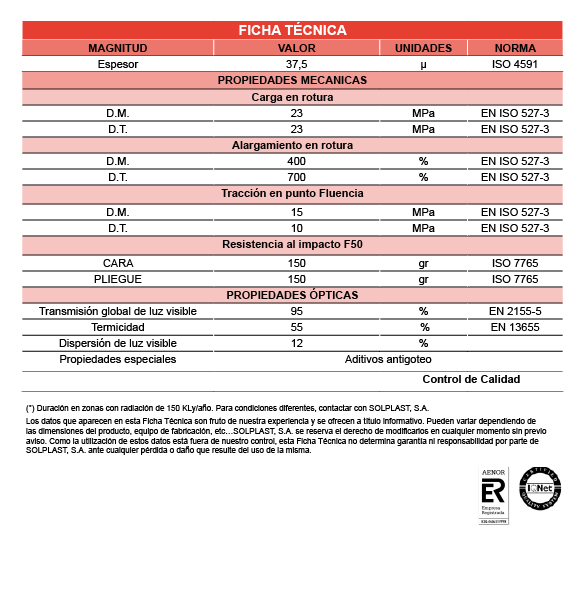 • SOLPLAST DC SOLTERM słynie z wysokiego stopnia przejrzystości i ochrony cieplnej. Te cechy sprawiają, że możliwe jest również przepuszczanie dużej ilości światła widzialnego do wnętrza szklarni, a tym samym zmniejszenie strat temperatury w nocy. To wzmacnia efekt cieplny pokrycia, zapobiegając potencjalnemu ryzyku mrozu i opóźniając wychłodzenie szklarni podczas najzimniejszej pory dnia.