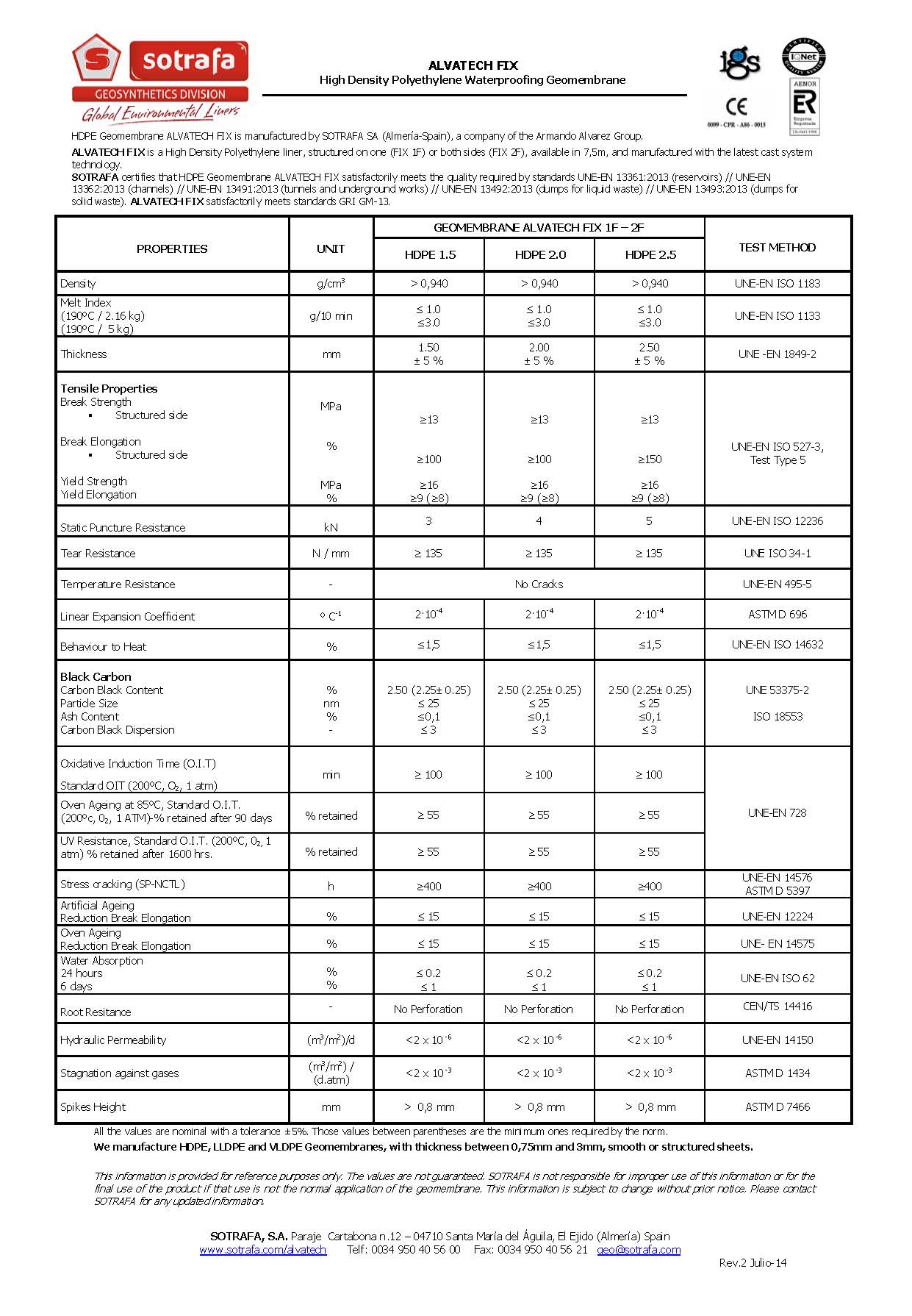 Geomembrana ALVATECH FIX wykonana z polietylenu HDPE o wysokiej gęstości, ze strukturą na jednej (1F) lub dwóch stronach (2F), przy znacznej ilości wypustek (57.000 wypustek / m2). Wysokość wypustek wynosi 1mm, dają one lepszy współczynnik tarcia na pochyłej ziemi i dużych stokach.