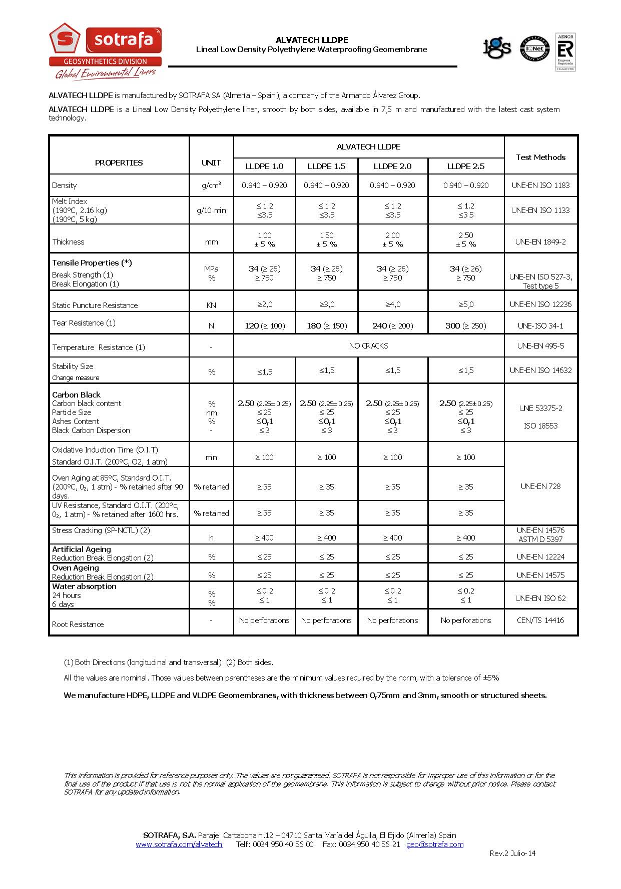 Geomembrana Alvatech LLDPE jest wodoodporna, wykonane specjalnej mieszanki na bazie polietylenu liniowego, który zapewnia wysoką elastyczność i właściwości spoinowe.